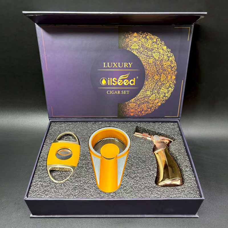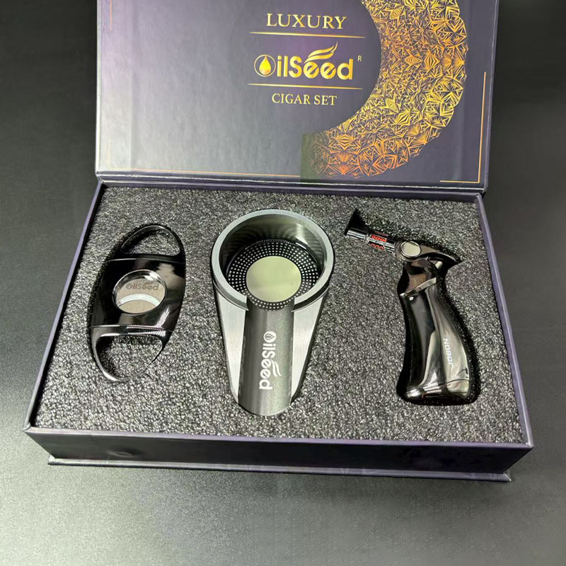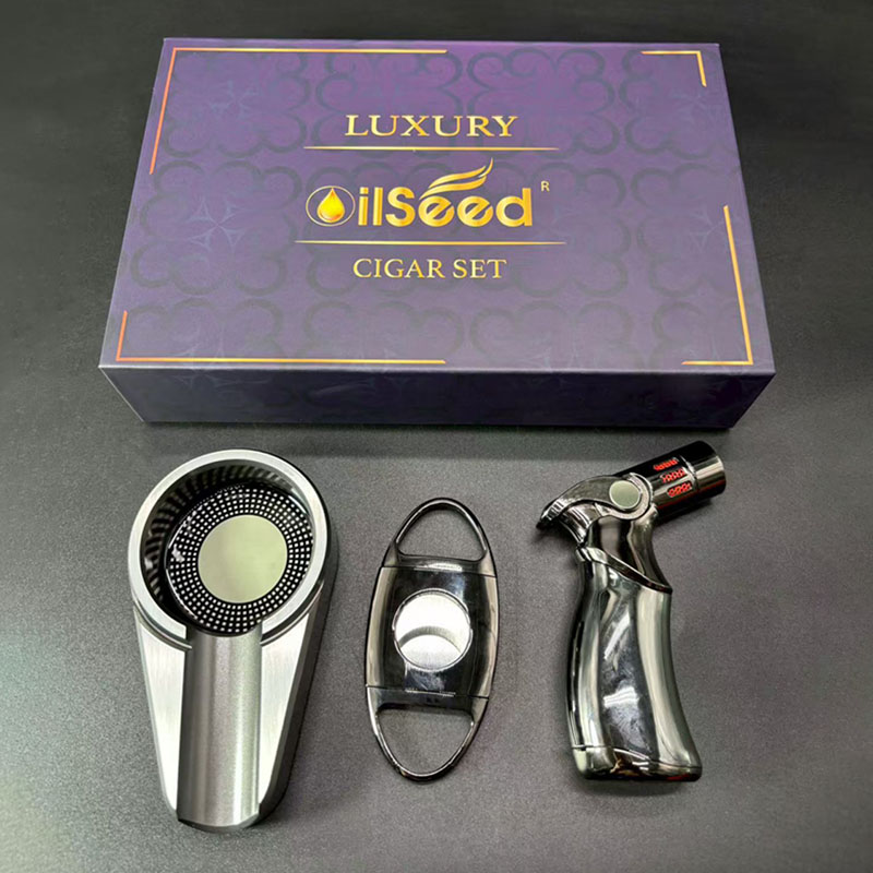 The OilSeed Luxury Cigar Set is an elegant collection of premium cigar accessories, thoughtfully packaged for cigar enthusiasts and gift buyers alike. Each set includes a double blade cigar cutter, a butane gas torch lighter, and an aluminum cigar ashtray with a single cigar holder—all designed with a sleek, luxury finish.